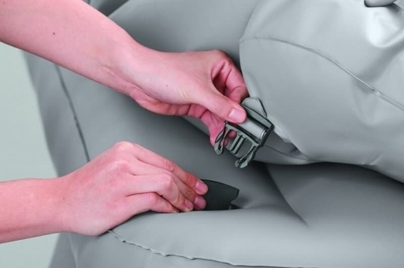 Кровать состоит из двух надувных матрасов, соединяемых клипсами на защелках. Каждый матрас имеет свой клапан и накачивается отдельно.